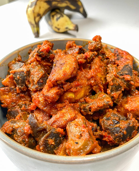 Gizzard cooked in herbs and spices until soft and tender mixed with fried ripe plantain and coated with red stew